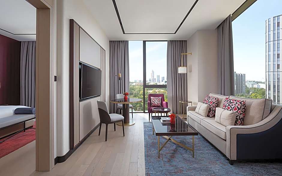 Suite located on floors 14-16 features a panoramic views of city Landmarks, magnificent king size bed and living room furnished with a transformer sofa-bed (for 1 adult of 2 children). Suite features a Nespresso coffee machine, 55" Smart TV with mobile screen mirroring, intuitive nighttime floor lighting, among other convenient details. The marble bathrooms have a walk-in shower with extended luxury amenities by Byredo and heated bathroom floor. Access to the exclusive Club InterContinental Lounge offers buffet breakfast, refreshments throughout the day, Afternoon Tea and the Evening Cocktail with a collection of spirits and wines. Connecting Suites are available. Wellness Center Access included.
